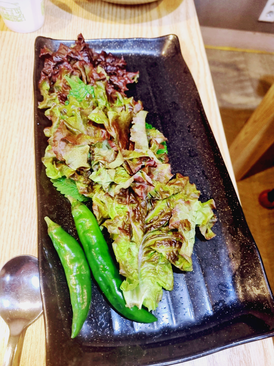 싱싱한 쌈채소들이 나옵니다. 상추와, 고추입니다.