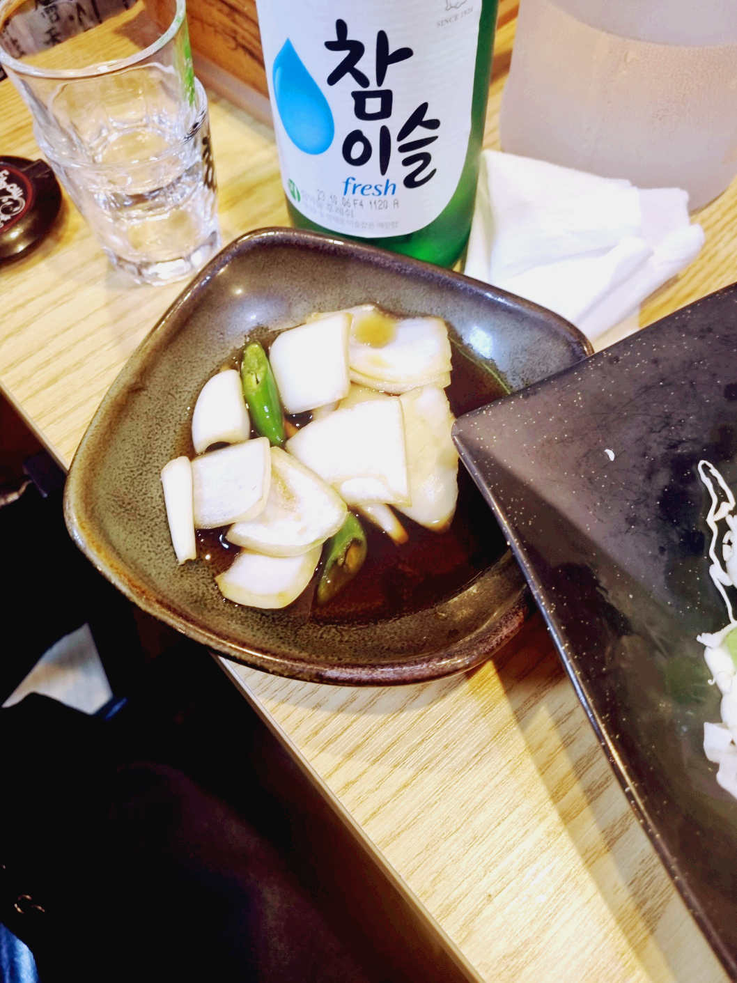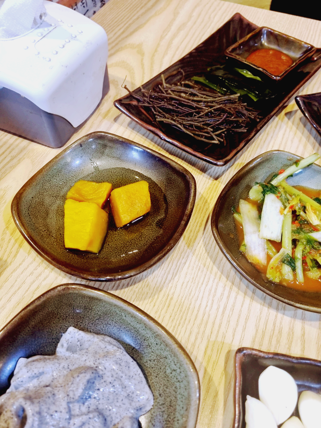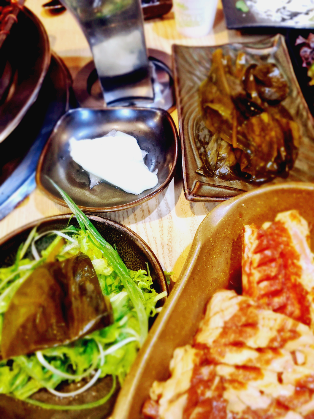 손이 가는 반찬이 많이 나와서 갈비 굽기 전에 가볍게 안주로 먹을 수 있는 것들이 많습니다. 구미 맛집 참숯골화로구이 밑반찬입니다.