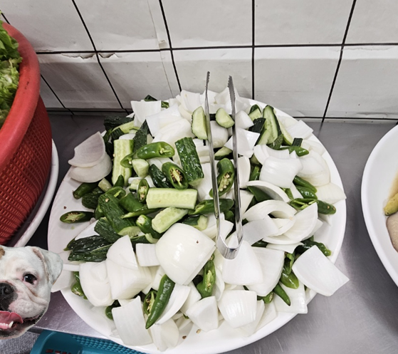 쌈 싸 먹을 때 짝꿍, 양파, 오이, 파가 썰려져 있습니다.