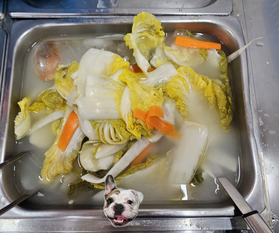 국물까지 시원한 백김치입니다. 식사 중에 한입 먹으면 진짜 입안이 개운해집니다.