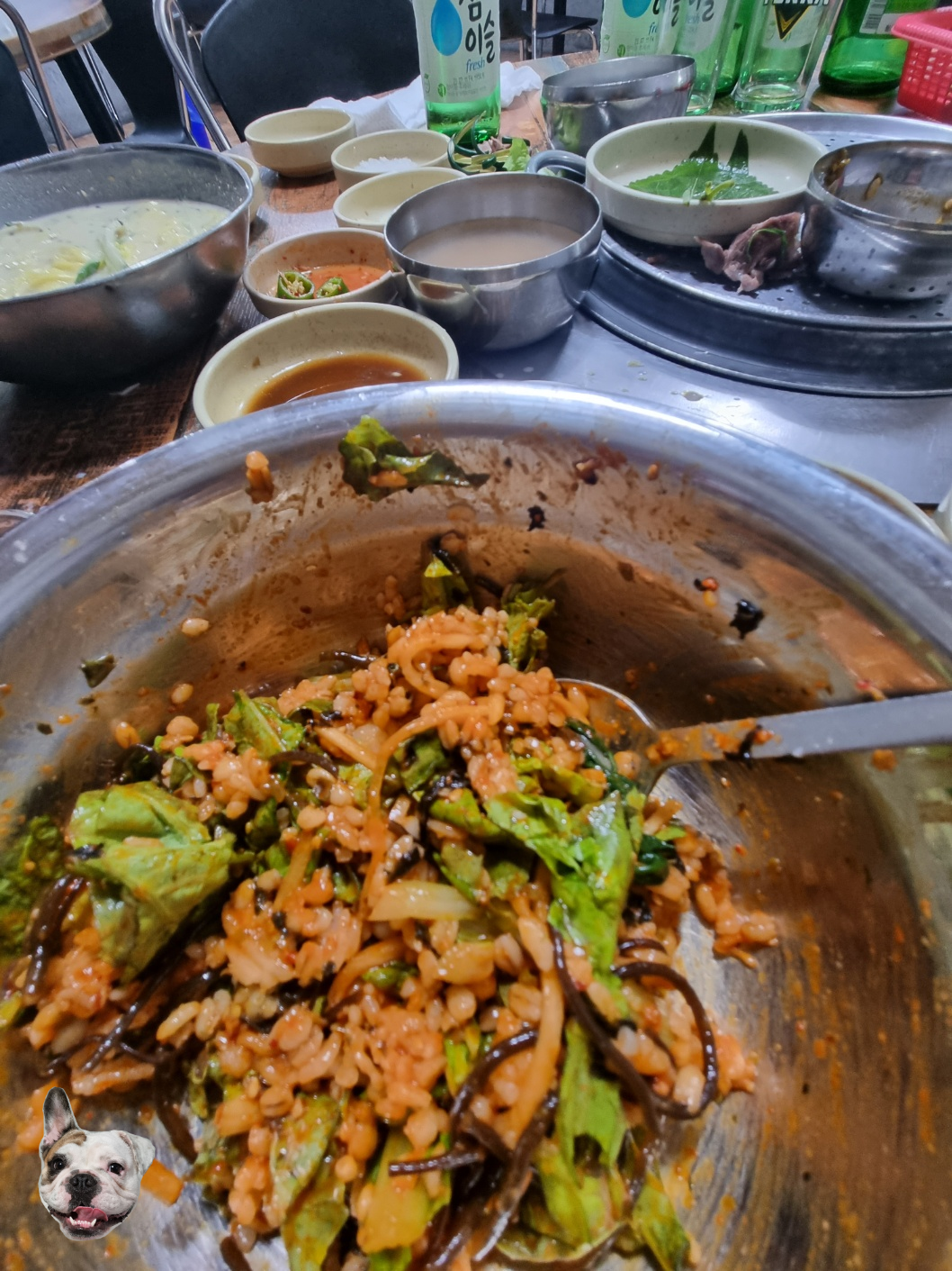 한국인은 밥심이라는 말이 있습니다. 보리비빔밥을 시키면 강된장과 숭늉을 주는데, 숭늉이 진짜 별미입니다.. 강된장과 고추장을 넣고 갖은 야채와 비벼먹으면 됩니다. 사진에 보면 찐 깻잎을 주는데 깻잎에 싸 먹어도 일품입니다.