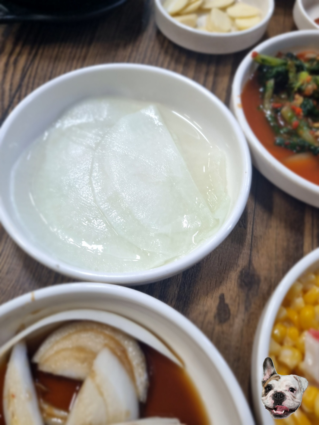 반찬 중에 물김치가 최고 맛있었습니다. 저 물김치만 있으면 뭐든 비벼먹기  좋겠다고 생각했었는데, 소면이랑 된장찌개와 먹어도 궁합이 좋습니다.
