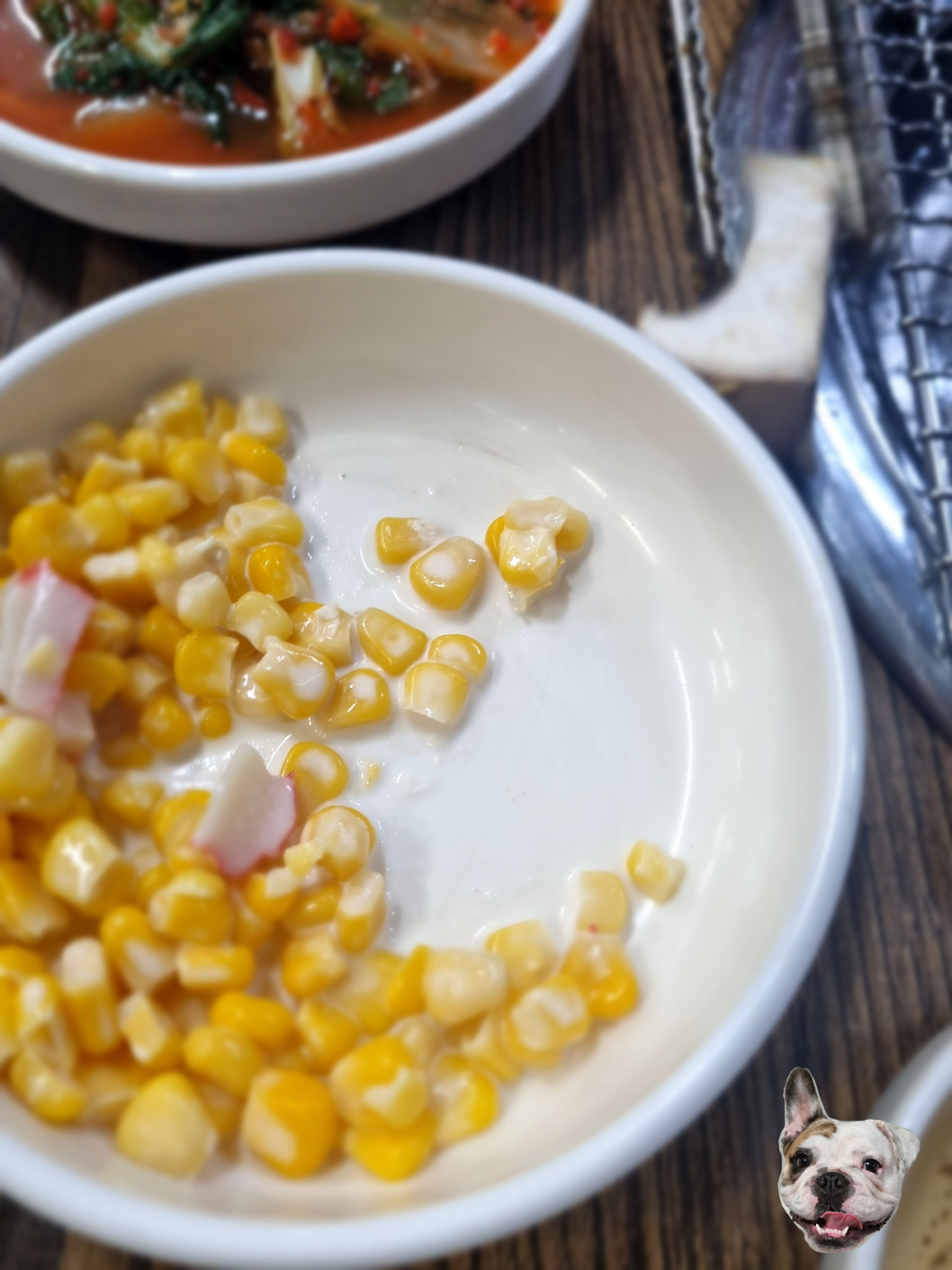 콘샐러드는 고기 나오기 전에 입을 심심하지 않게 해 주고, 또한 아이들이 먹기 좋은 반찬입니다.
