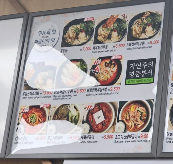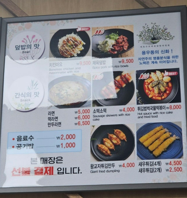가게 앞에 입간판이 있어서 빠르게 찾을 수 있습니다. 김천구미역 밥집 용우동은 안심식당으로 덜어먹기 가능한 도구 비치가 되어있고 위생적인 수저관리와 종사자의 마스크 착용을 준수하는 소재지 지자체의 인증을 받은 음식점입니다.
