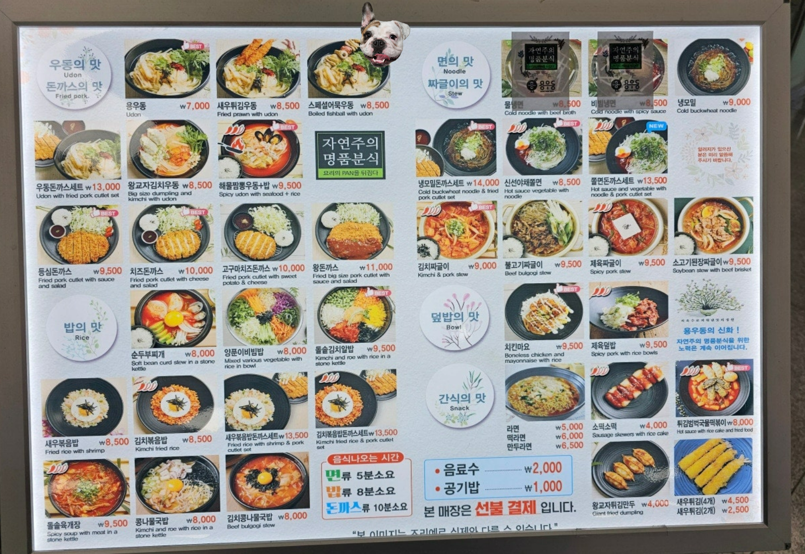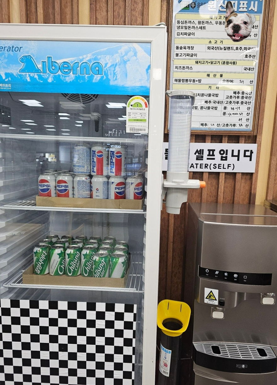 김천구미역 기차역에 있는 음식점 특성상 음식 나오는 시간이 나와있습니다. 면류는 5분 소요, 밥류는 8분 소요, 돈가스 류는 10분 소요가 됩니다. 기차시간에 맞춰서 메뉴를 결정하는데 많은 도움이 됩니다. 특이한 점은 선불결제로 진행되고 있으며, 반찬들은 셀프로 챙겨야 합니다.