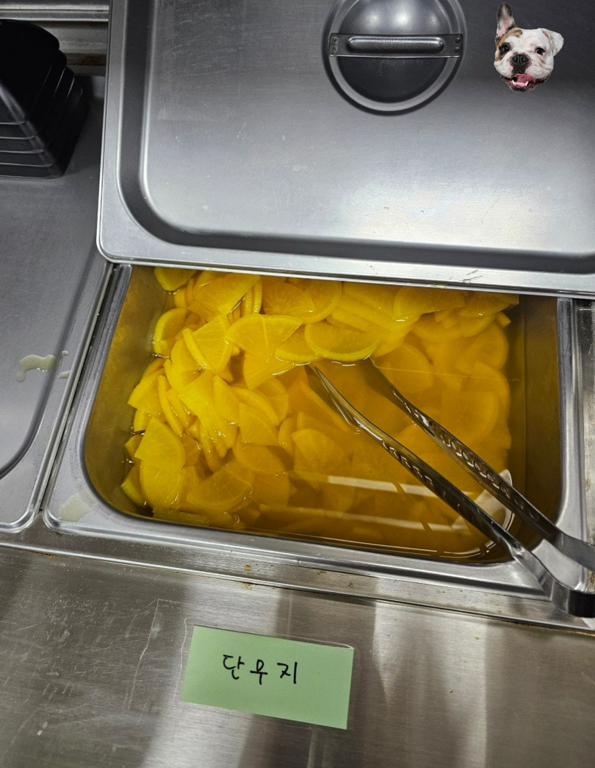 셀프코너가 있어서 김치와 단무지가 기본으로 세팅되어 있습니다. 반찬이 함께 나오지 않아서 음식을 기다리는 동안 우선 챙겨두는 것이 시간 절약에 좋습니다. 물도 셀프입니다.